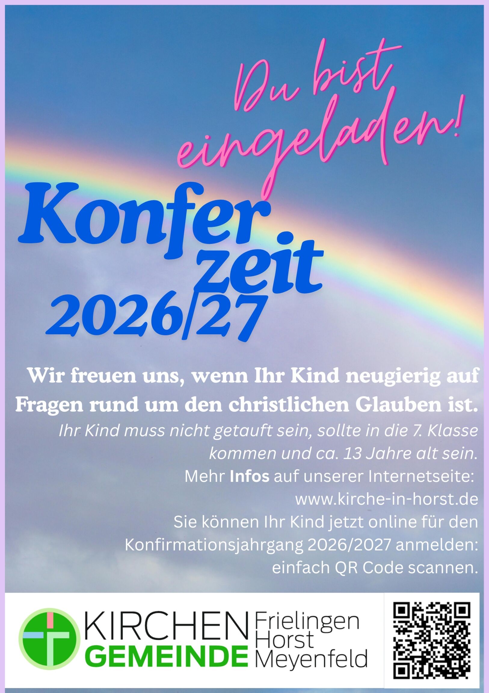 Wir freuen uns, wenn Ihr Kind neugierig auf Fragen rund um den christlichen Glauben ist. Sie können Ihr Kind online für den Konfirmationsjahrgang 2026/2027 anmelden, den Link finden Sie unten.