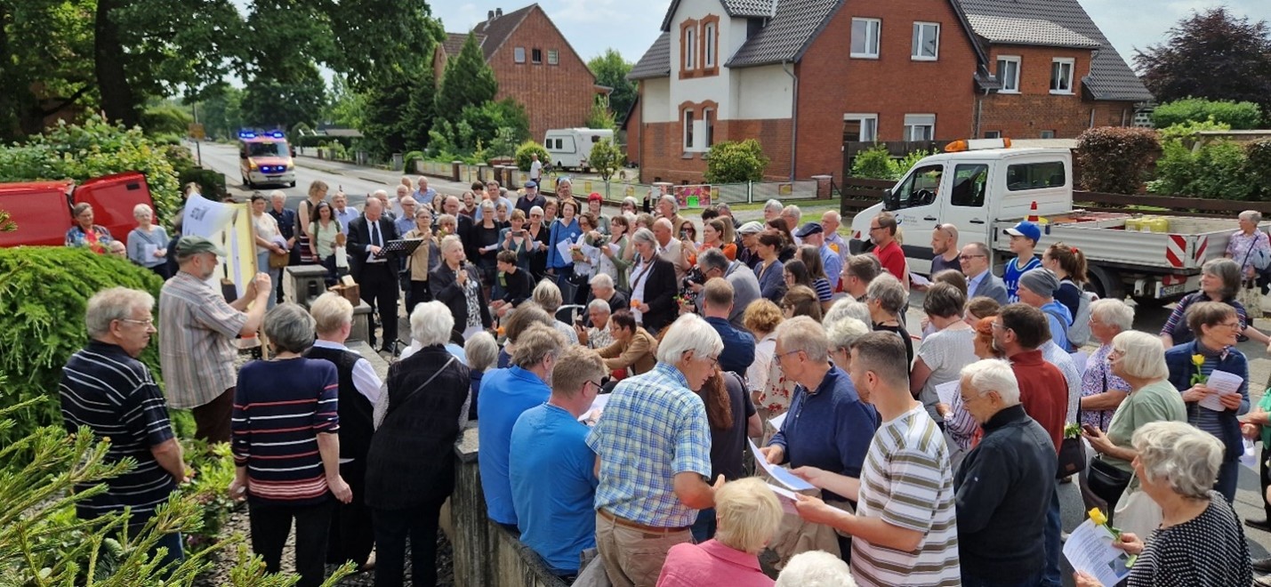 Das Thema wurde schon durch Pastor Burandt in seiner Predigt aufgegriffen. Im Anschluss wurde in der Andreaestrasse 33 der Stolperstein verlegt, mehr als 100 Menschen waren anwesend.
