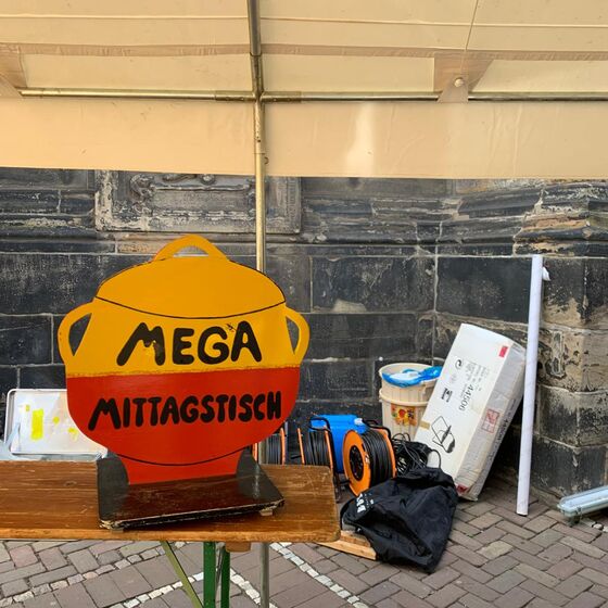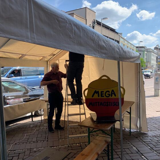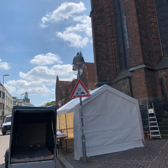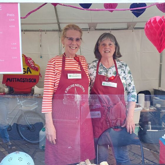 Bereits am Dienstag, einen Tag vor dem großen Eröffnungsabend, wurde unser Gemeindehaus zur Suppenküche: Fleißige ehrenamtliche Mitarbeiterinnen haben aus frischem Gemüse 100 Liter Kartoffel- und Linsensuppe gekocht. Die Suppe wurde über Nacht ins Kühlhaus gebracht, bevor sie am nächsten Tag an einem professionell aufgebauten Stand verkauft wurde – bei strahlendem Sonnenschein und bester Stimmung direkt hinter der Marktkirche, im Zentrum des Geschehens.