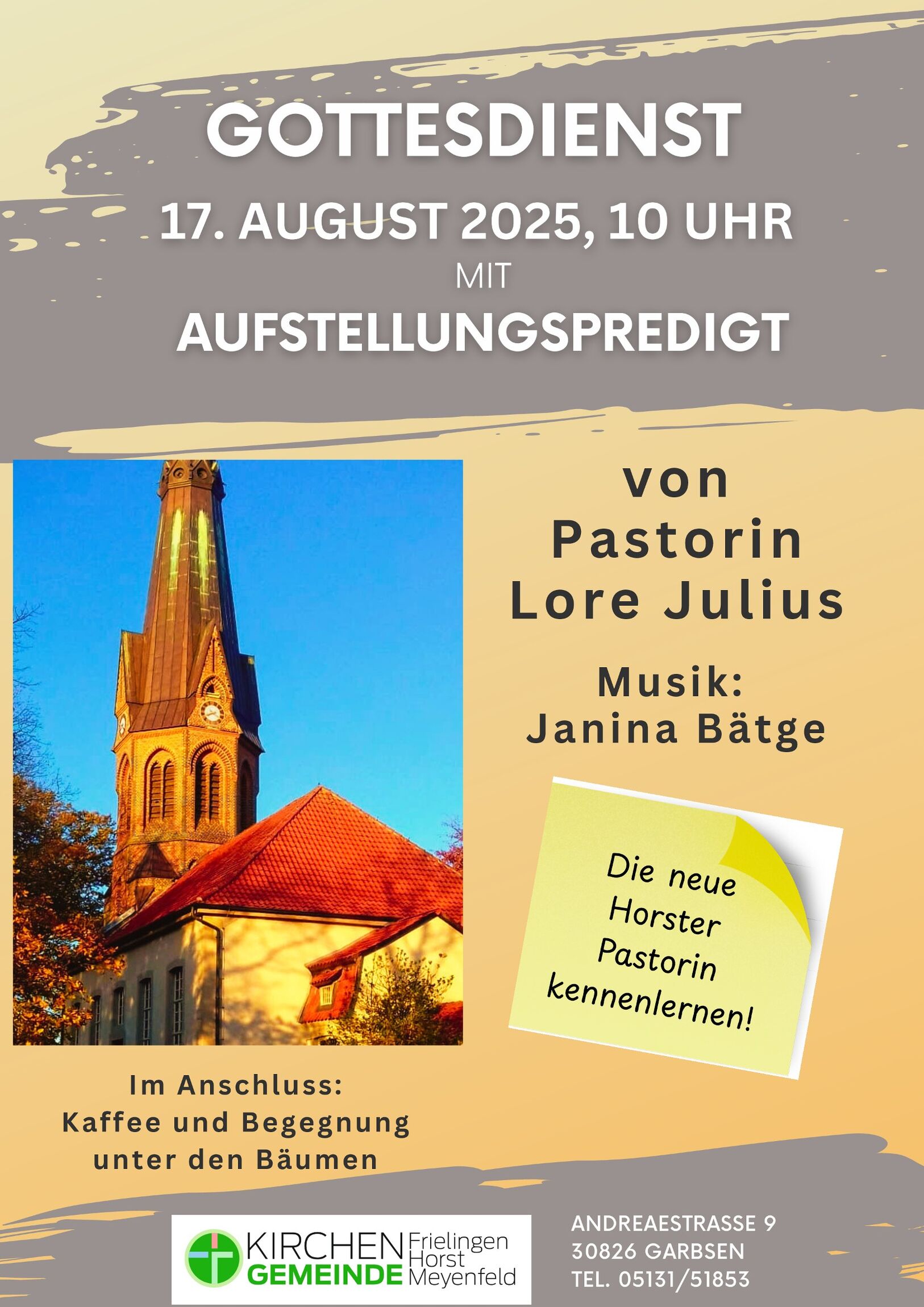 Wir freuen uns sehr, dass Frau Julius am Sonntag, den 17. August 2025 um 10:00 Uhr den Gottesdienst in unserer Kirche leiten und sich dabei der Gemeinde vorstellen wird. Im Anschluss laden wir herzlich zu einem Kaffee unter den Bäumen ein – eine schöne Gelegenheit, miteinander ins Gespräch zu kommen.