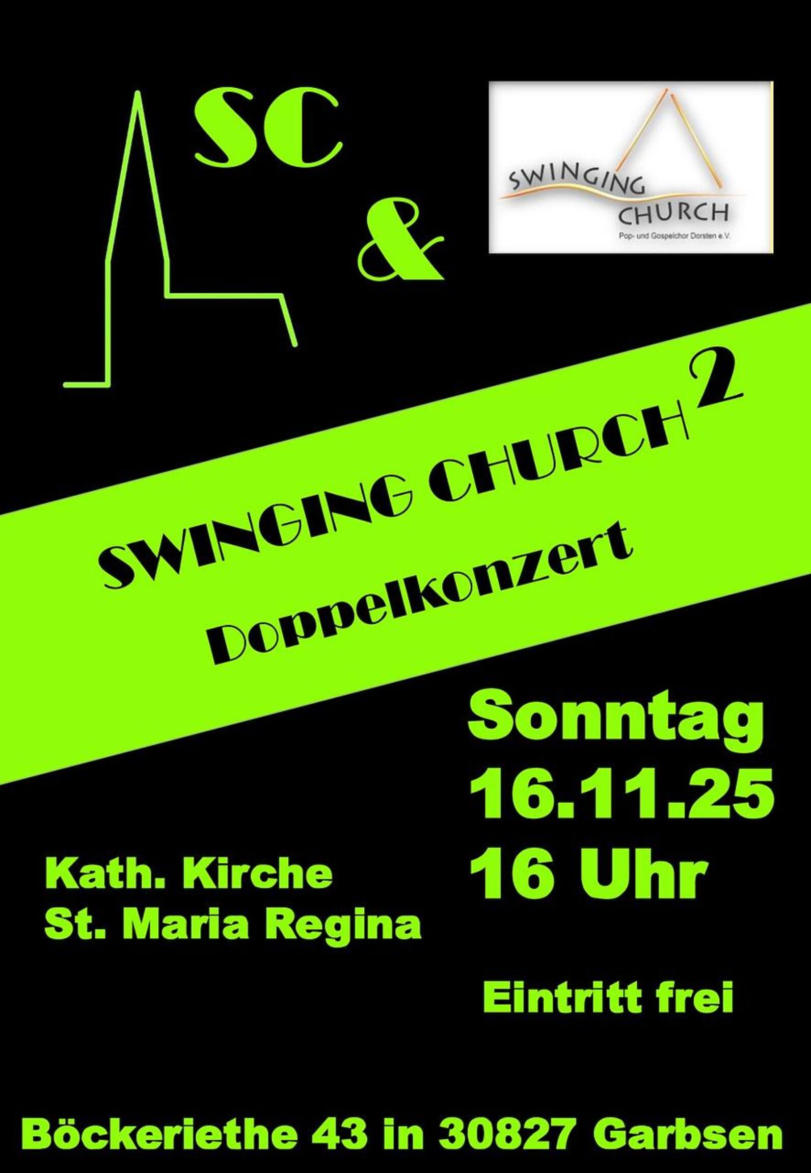Zusammen mit dem gleichnamigen Gospelchor aus Dorsten im Münsterland gibt der Gospelchor Swinging Church aus Horst-Meyenfeld-Frielingen ein Gemeinschaftskonzert.