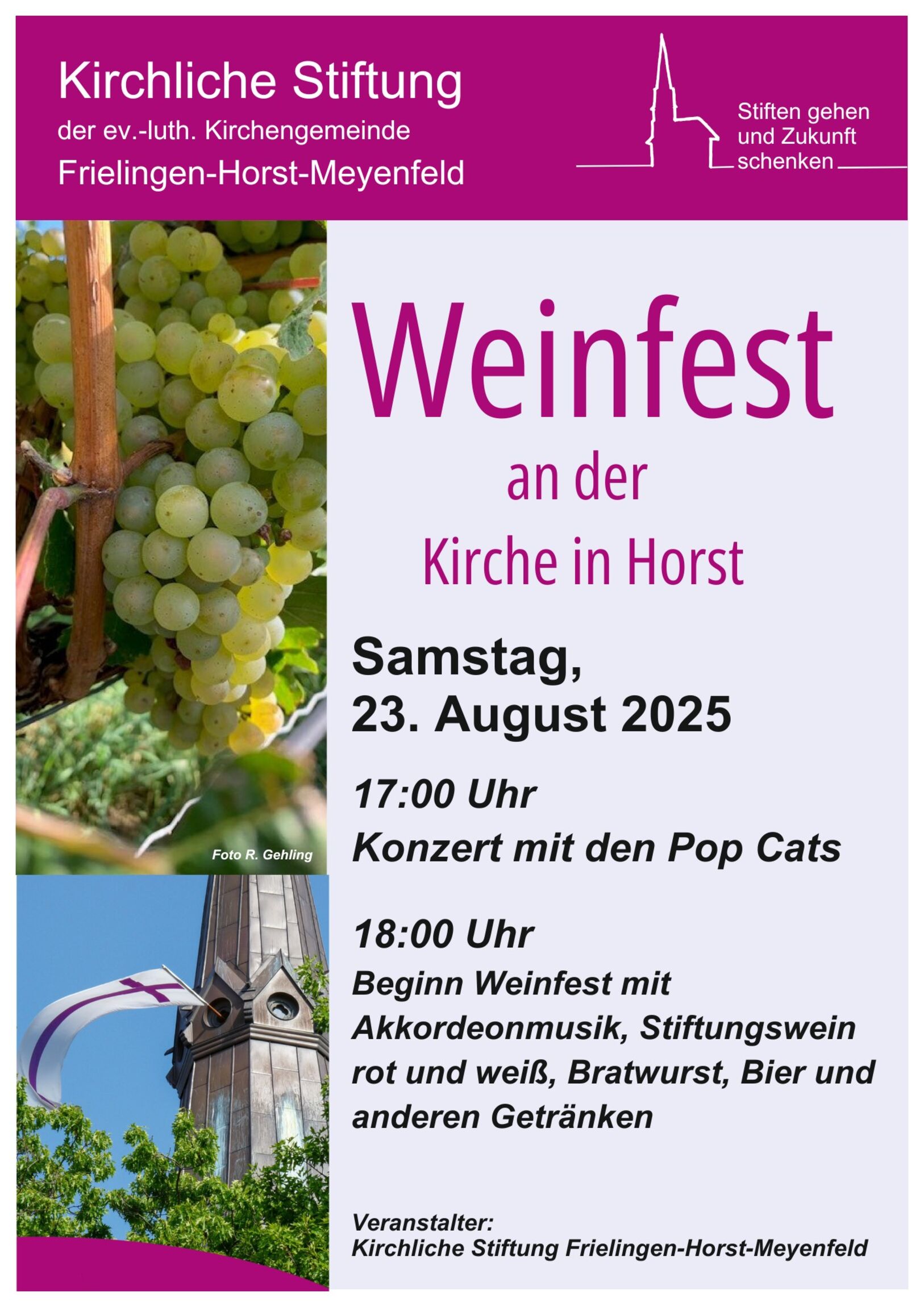 Am 23. August lädt die Kirchliche Stiftung zu einem gemütlichen Abend bei gutem Wein, frisch gegrillte Bratwürstchen und schöner Musik in den Pfarrgarten ein.