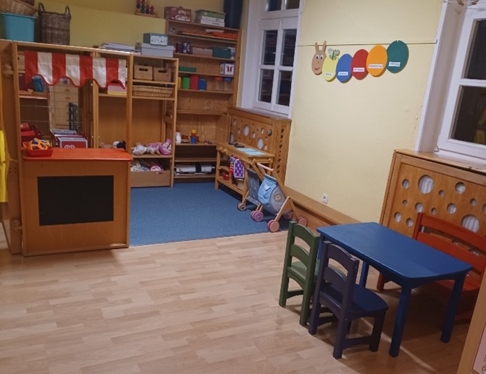 Der Gruppenraum ist unterteilt in verschiedene Bereiche. Beispielsweise können die Kinder in der Puppenecke mit Puppen und Küchenmaterialien spielen, auf dem Podest sich gemütlich in Kissen und Decken einkuscheln oder Vögel und Eichhörnchen am Fenster beobachten.